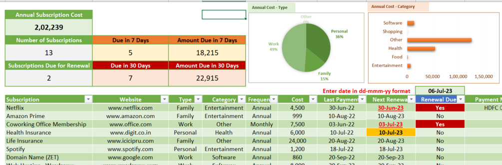 This subscription tracker excel template serves as an effective solution to monitor all your subscriptions - work and personal. You get to know the upcoming renewals, cashflow required in the next 7 days and 30 days.